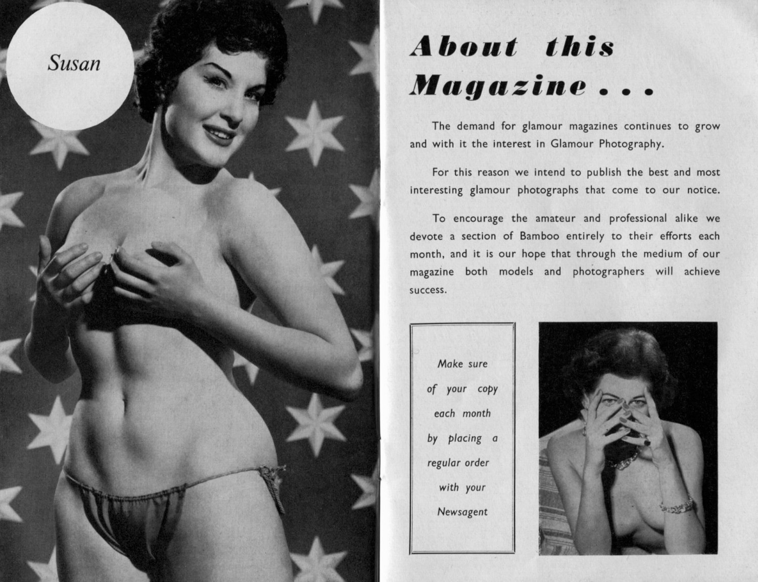 Travel back to 1958 with Bamboo No 1! This digital edition showcases 56 pages of stunning pin-up models Models: Lee Wilson, Rita Royce, Daurene Dore, Lauree Lee, Dawn Stevens, Ann Beard, Mary Bettis, Lorraine Burnett, Susan, Pat Holland, Terry Montgomery, Pamela Finch, Pat Scarlett Rebel, Rita Royce, Pat Holland, Rosa Delmai (Domaille), Deedee, Terry Montgomery, Sue & Sal Simpson, Fiona Cullam, Jenny Truman, Rosa Revell, Sue Simpson, Lilli Ghianni, Ely Panajotis, Annie Gorassini, Edith, Vicki Smith & Kay Douglas & Jean Parsons & Jane Dore & Rosalind Ashley, Pamela Finch, Terry Montgomery, Beryl Chambers, Terry Montgomery, Yvonne Shearer. A vintage gem for collectors and fans of classic pin-up beauty! 🌟📖✨